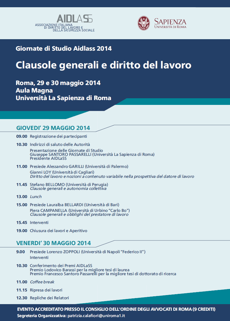 Da Gio, 29/05/2014 a Gio, 29/05/2014 Mode On-site-only 14/11/2022 ROMA - Clausole generali e diritto del lavoro. Giornate di Studio Aidlass 2014 (29-30 maggio 2014) on-site only |