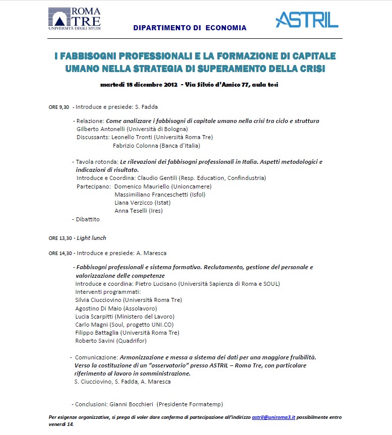 Da Mar, 18/12/2012 a Mar, 18/12/2012 Mode On-site-only 14/11/2022 ROMA - I fabbisogni professionali e la formazione di capitale umano nella strategia di superamento della crisi on-site only | Università degli Studi Roma Tre, Dipartimento di Economia - 9.30
