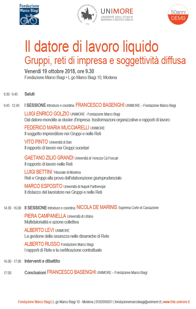 Da Ven, 19/10/2018 a Ven, 19/10/2018 Mode On-site-only 14/11/2022 ROMA - Il datore di lavoro liquido. Gruppi, reti di impresa e soggettività diffusa on-site only | L.go Marco Biagi, 10 ore 9.30
