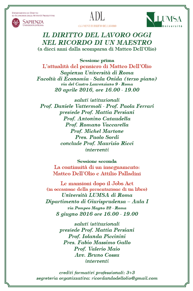 Da Mer, 20/04/2016 a Mer, 20/04/2016 Mode On-site-only 14/11/2022 ROMA - Il diritto del lavoro oggi - Nel ricordo di un Maestro (20 aprile - 8 giugno 2016) on-site only | Via del Castro Laurenziano, 9 - ore 16