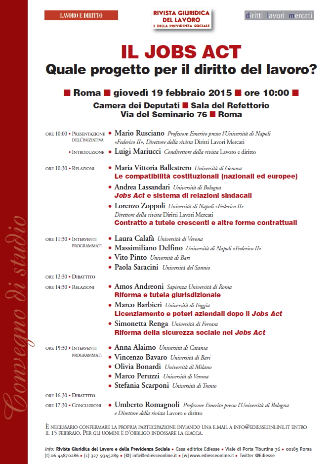 Da Gio, 19/02/2015 a Gio, 19/02/2015 Mode On-site-only 14/11/2022 ROMA - Il Jobs Act. Quale progetto per il diritto del lavoro? on-site only | Via del Seminario 76 - 10:00
