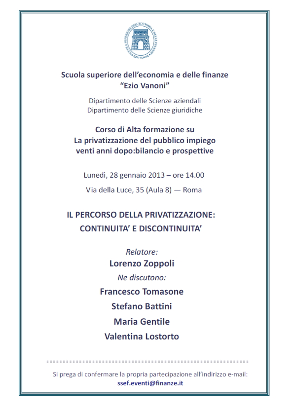 Da Lun, 28/01/2013 a Lun, 28/01/2013 Mode On-site-only 14/11/2022 ROMA - Il percorso della privatizzazione: continuità e discontinuità on-site only | Scuola Superiore dell'Economia e delle Finanze "Ezio Vanoni" - 14.00