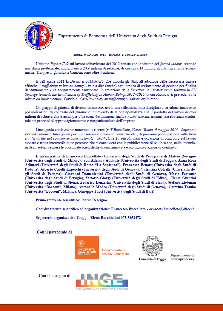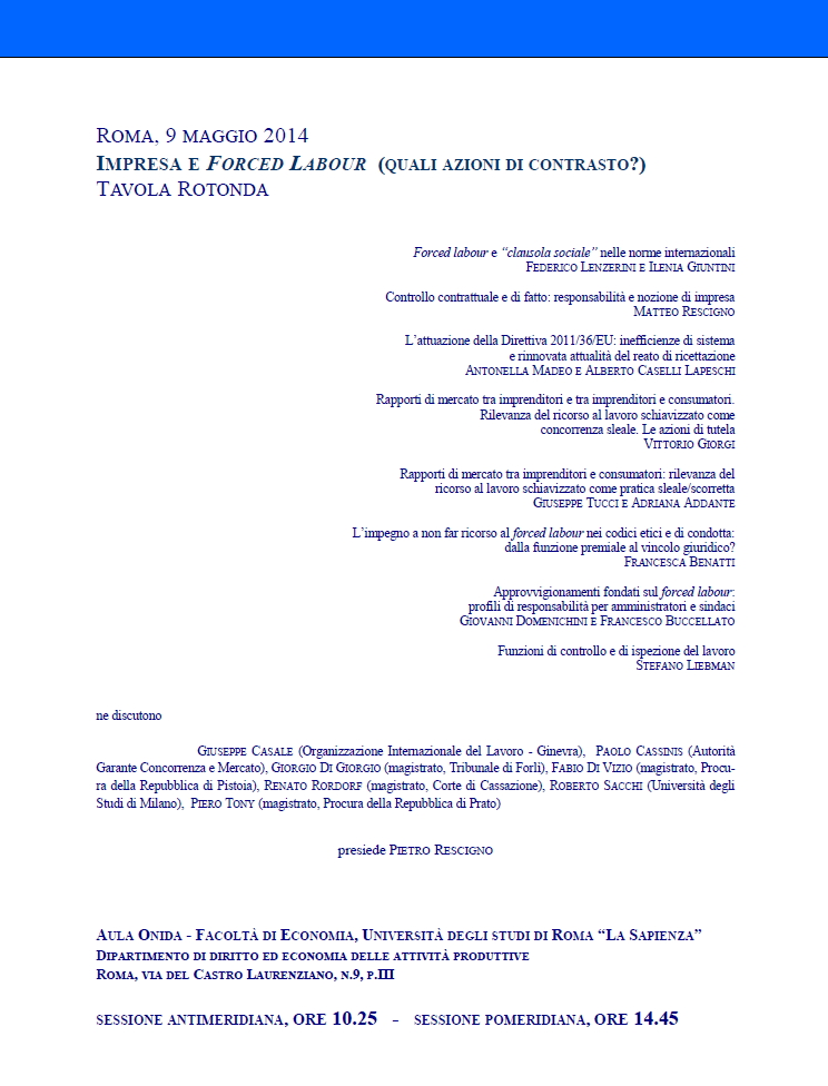 Da Ven, 09/05/2014 a Ven, 09/05/2014 Mode On-site-only 14/11/2022 ROMA - Impresa e forced labour (quali azioni di contrasto?). Tavola rotonda on-site only | via del Castro Laurenziano 9 - 10.25