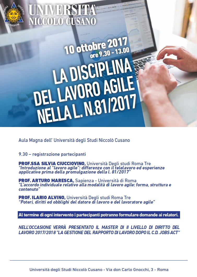 Da Mar, 10/10/2017 a Mar, 10/10/2017 Mode On-site-only 14/11/2022 ROMA - La disciplina del lavoro agile nella L. n. 81/2017 on-site only | Via don Carlo Gnocchi, 3 - ore 9.30