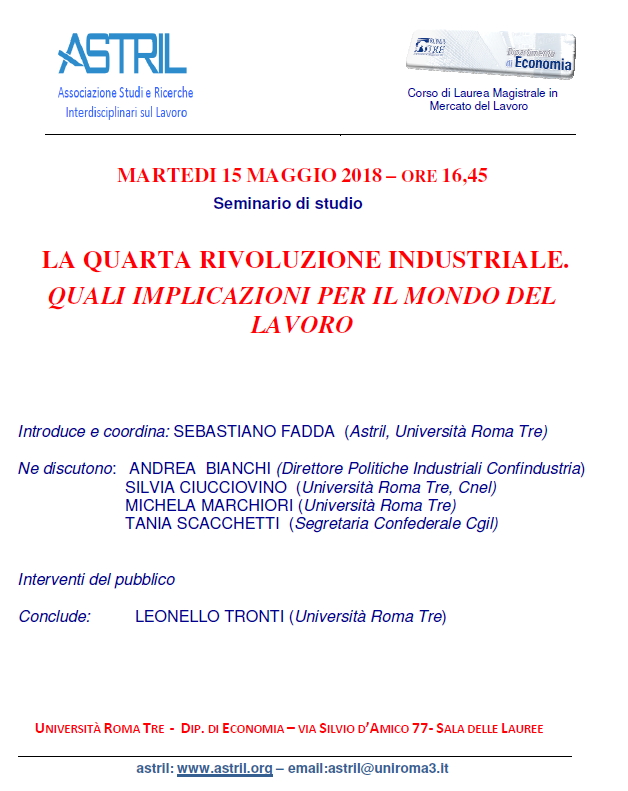 Da Mar, 15/05/2018 a Mar, 15/05/2018 Mode On-site-only 14/11/2022 ROMA - La quarta rivoluzione industriale. Quali implicazioni per il mondo del lavoro on-site only | Via Silvio D’Amico, 77 - ore 16.45