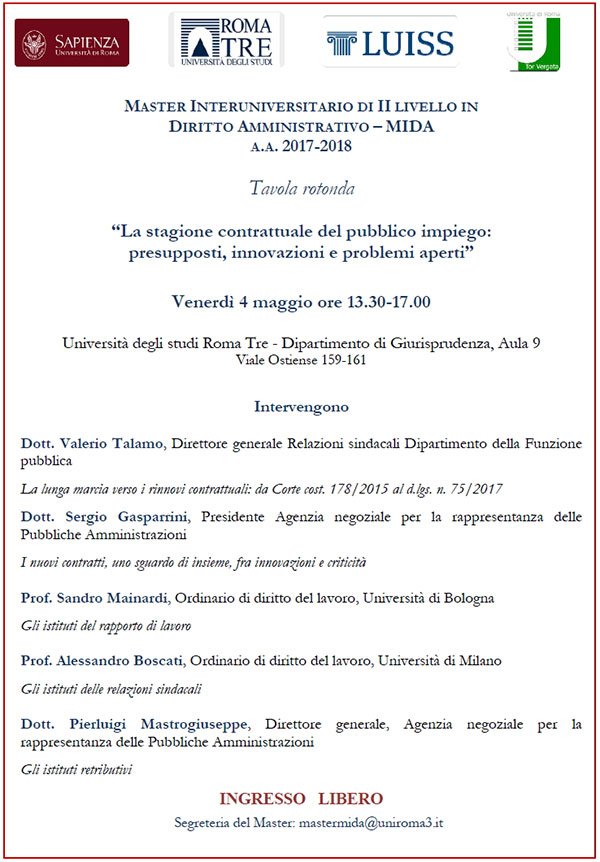 Da Ven, 04/05/2018 a Ven, 04/05/2018 Mode On-site-only 14/11/2022 ROMA - La stagione contrattuale del pubblico impiego: presupposti, innovazioni e problemi aperti on-site only | Viale Ostiense, 159-161 - ore 13.30