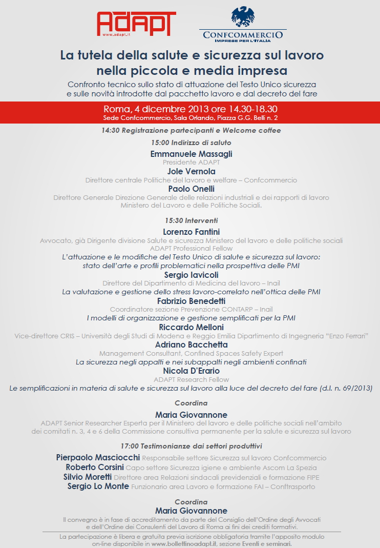Da Mer, 04/12/2013 a Mer, 04/12/2013 Mode On-site-only 14/11/2022 ROMA - La tutela della salute e sicurezza sul lavoro nella piccola e media impresa on-site only | Piazza G.G. Belli 2 - 14,30