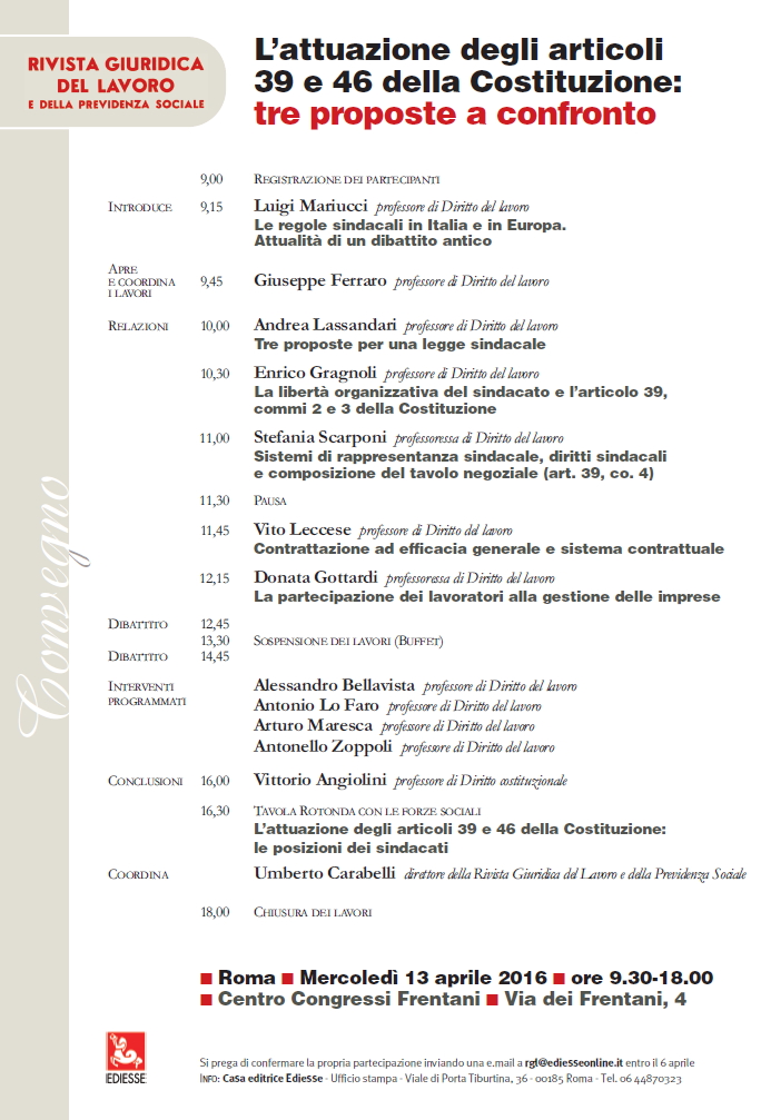 ROMA - L’attuazione degli articoli 39 e 46 della Costituzione: tre proposte a confronto