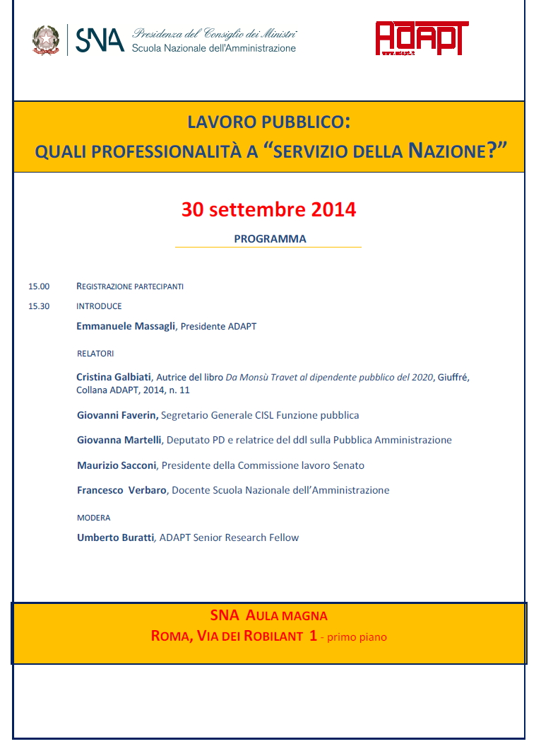 Da Mar, 30/09/2014 a Mar, 30/09/2014 Mode On-site-only 14/11/2022 ROMA - Lavoro pubblico: quali professionalità a “servizio della Nazione?” on-site only | via dei Robilant 1 - 15.00