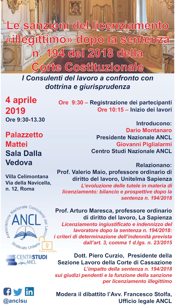 ROMA - Le sanzioni del licenziamento "illegittimo" dopo la sentenza n. 194 del 2018 della Corte Costituzionale. I Consulenti del lavoro a confronto con dottrina e giurisprudenza