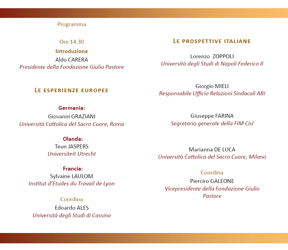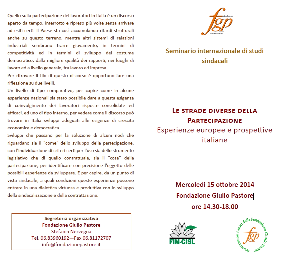 Da Mer, 15/10/2014 a Mer, 15/10/2014 Mode On-site-only 14/11/2022 ROMA - Le strade diverse della Partecipazione. Esperienze europee e prospettive italiane. Seminario internazionale di studi sindacali on-site only | Fondazione Giulio Pastore, via del Viminale, 43 - 14.30