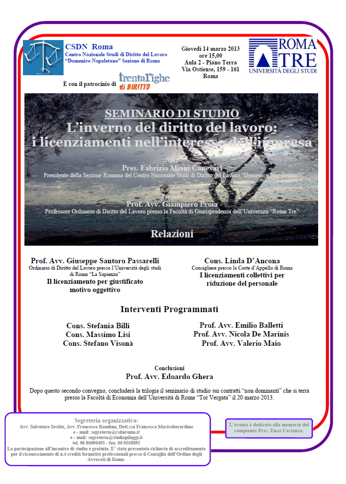 Da Gio, 14/03/2013 a Gio, 14/03/2013 Mode On-site-only 14/11/2022 ROMA - L’inverno del diritto del lavoro: i licenziamenti nell’interesse dell’impresa on-site only | via Ostiense 159-161 - 15.00