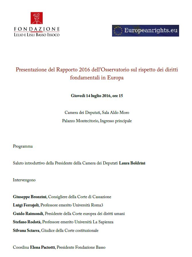 Nel momento in cui l’Europa continua a raffigurare se stessa come un ingresso vietato alle migliaia di famiglie in fuga dalle bombe e abbandona a se stessi i Paesi - come la Grecia - che tentano di declinare i principi fondativi del progetto europeo accogliendo i profughi dal Mediterraneo, il nuovo Rapporto 2016 dell’Osservatorio sul rispetto dei diritti fondamentali in Europa appare come un importante richiamo alla coscienza giuridica e politica del nostro continente e definisce i limiti entro cui il complesso sistema di giustizia del continente europeo rispetta i principi della Carta dei Diritti Fondamentali dell’Unione Europea.