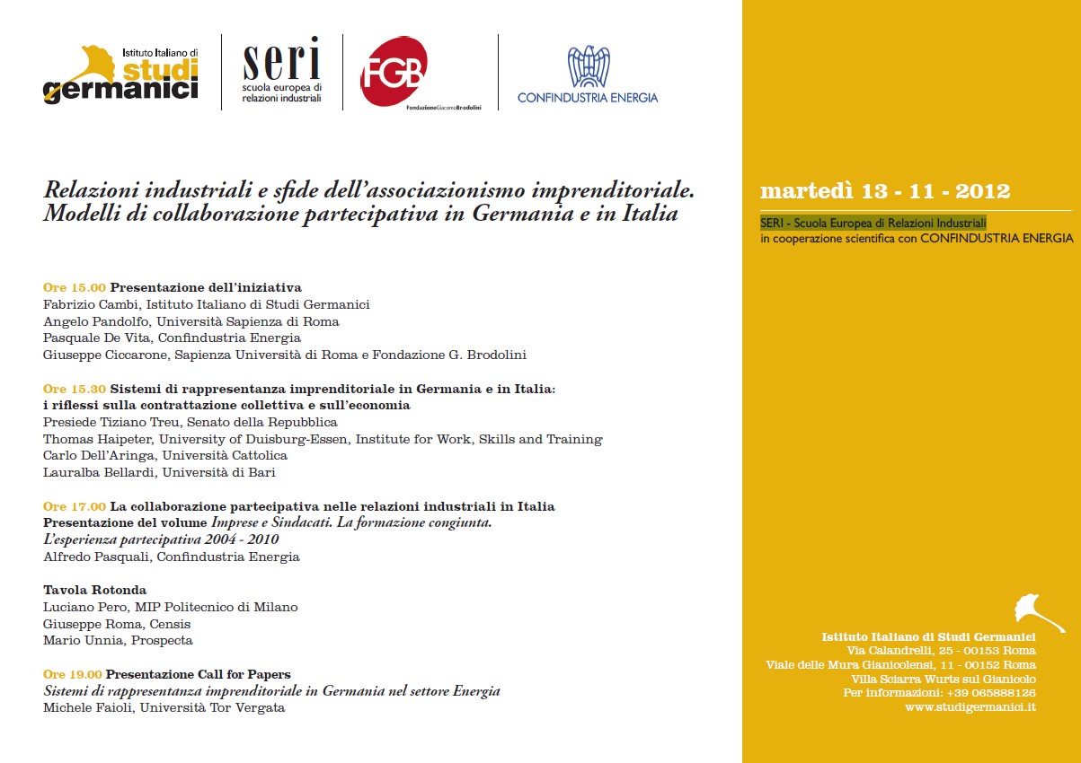 Da Mar, 13/11/2012 a Mar, 13/11/2012 Mode On-site-only 14/11/2022 ROMA - Relazioni industriali e sfide dell’associazionismo imprenditoriale. Modelli di collaborazione partecipativa in Germania e in Italia on-site only | SERI - Scuola Europea di Relazioni Industriali - 15.30