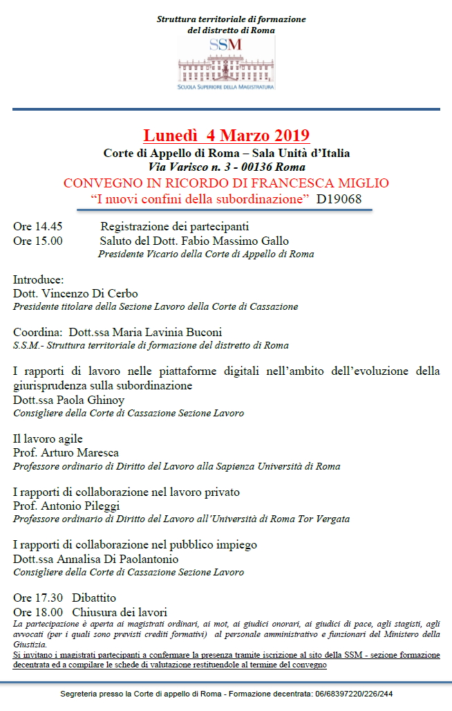 Da Lun, 04/03/2019 a Lun, 04/03/2019 Mode On-site-only 14/11/2022 ROMA - In ricordo di Francesca Miglio | I nuovi confini della subordinazione on-site only | Via Varisco, 3 - ore 14.45