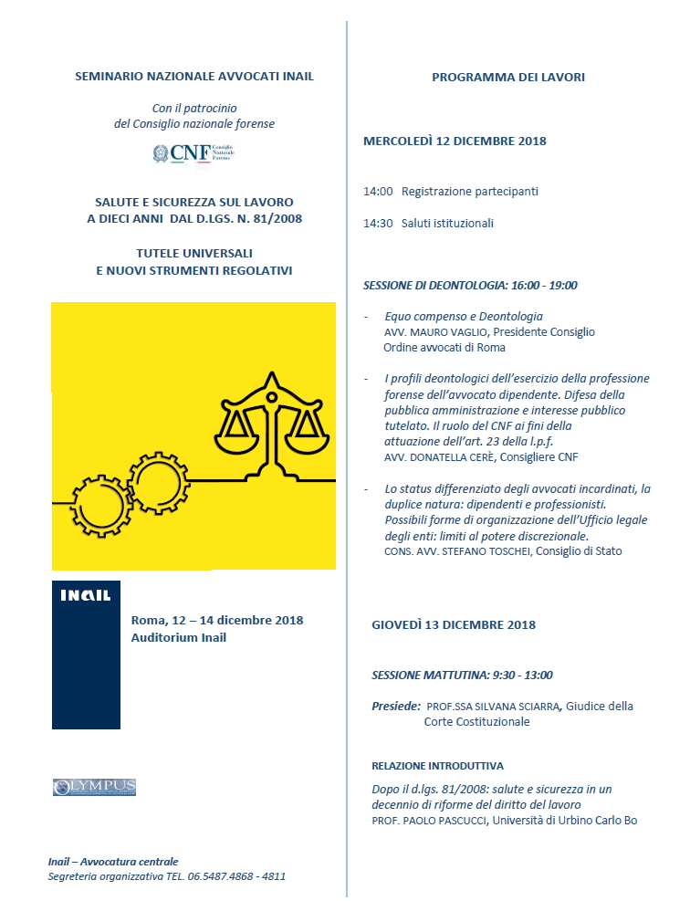 Da Mer, 12/12/2018 a Mer, 12/12/2018 Mode On-site-only 14/11/2022 ROMA - Salute e sicurezza sul lavoro a dieci anni dal D.Lgs n. 81/2008 (12-14 dicembre 2018) on-site only | Auditorium Inail - ore 14