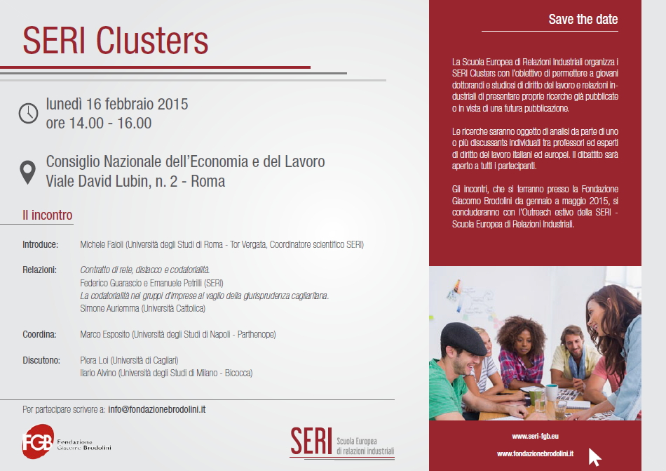 Da Lun, 16/02/2015 a Lun, 16/02/2015 Mode On-site-only 14/11/2022 ROMA - Scuola Europea di Relazioni Industriali: SERI Clusters on-site only | Viale David Lubin, 2 - 14:00