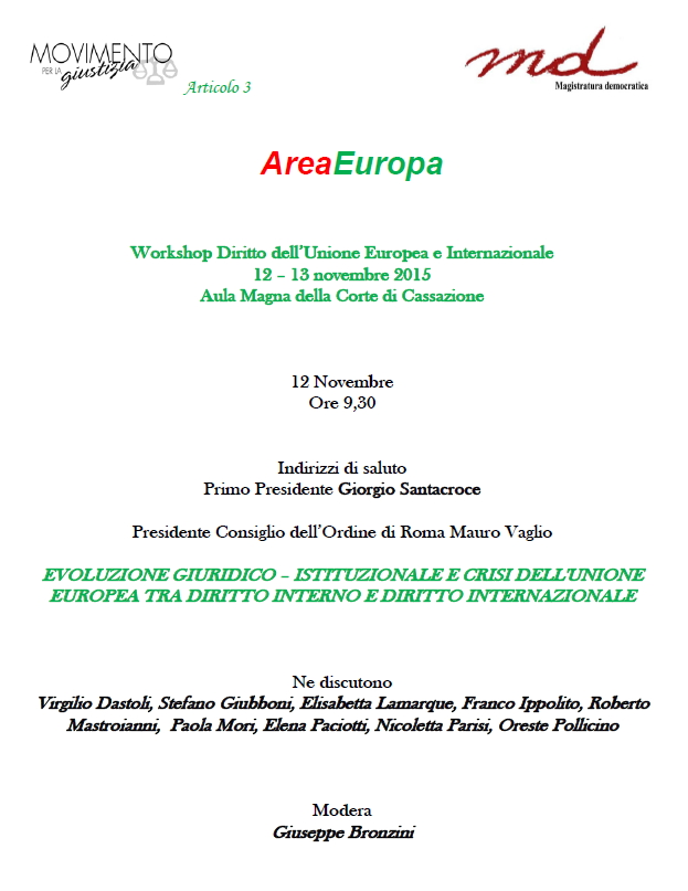 Da Gio, 12/11/2015 a Gio, 12/11/2015 Mode On-site-only 14/11/2022 ROMA - Workshop Diritto dell’Unione Europea e Internazionale (12-13 novembre 2015) on-site only | Aula Magna della Corte di Cassazione - ore 9:30