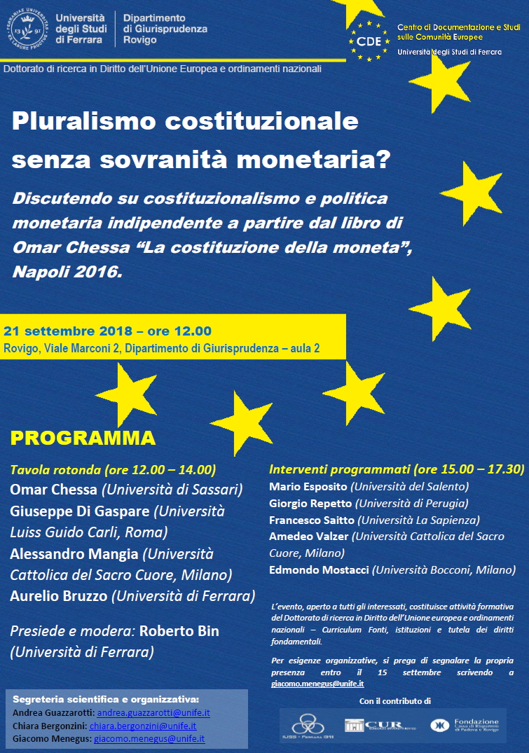 Da Ven, 21/09/2018 a Ven, 21/09/2018 Mode On-site-only 14/11/2022 ROVIGO - Pluralismo costituzionale senza sovranità monetaria? on-site only | Viale Marconi, 2 - ore 12