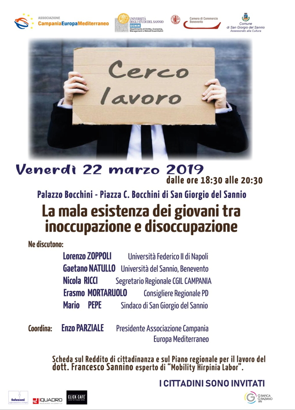 Da Ven, 22/03/2019 a Ven, 22/03/2019 Mode On-site-only 14/11/2022 SAN GIORGIO DEL SANNIO - La mala esistenza dei giovani tra inoccupazione e disoccupazione on-site only | Piazza C. Bocchini - ore 18.30