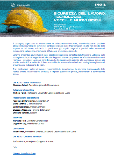 Il convegno, organizzato da Unioncamere in collaborazione con INAIL, intende discutere i problemi attuali della sicurezza del lavoro nel contesto originato dalle trasformazioni in atto nel mondo delle imprese e del lavoro, valutando in particolare gli impatti negativi e positivi delle innovazioni tecnologiche sulla origine, morfologia, diffusione e prevenzione dei rischi.