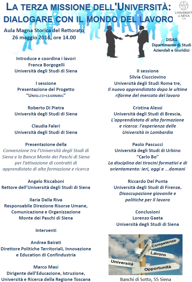 Da Lun, 26/05/2014 a Lun, 26/05/2014 Mode On-site-only 14/11/2022 SIENA - La terza missione dell'Università: dialogare con il mondo del lavoro on-site only | Banchi di Sotto, 55 - 14.00