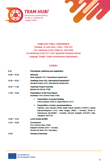 The final conference of the TeamHub project will take place on June 20, 2024, from 10AM to 3PM, at the Sala Santi of the CGIL national headquarters, Corso d’Italia 25, Rome.