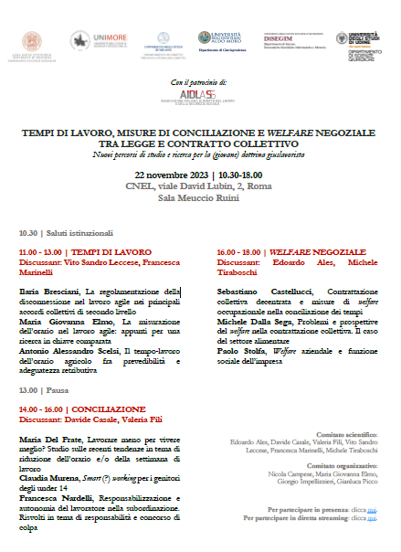 Il seminario ha per oggetto la discussione di paper selezionati elaboratori da dottorandi/e, assegnisti/e di ricerca e ricercatori/trici nell'area del diritto del lavoro e delle relazioni industriali.