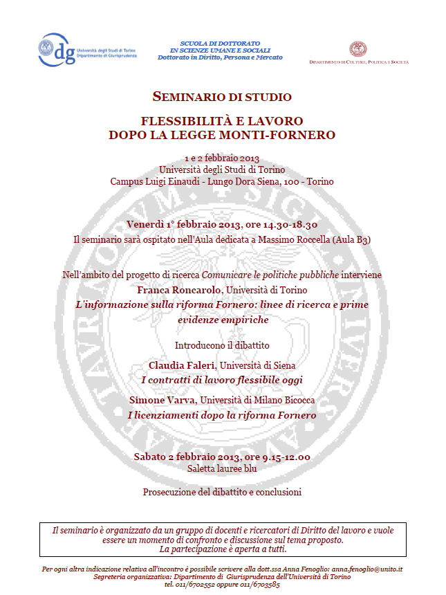 Da Sab, 02/02/2013 a Sab, 02/02/2013 Mode On-site-only 14/11/2022 TORINO - Flessibilità e lavoro dopo la legge Monti-Fornero on-site only | Campus Luigi Einaudi - Lungo Dora Siena, 100