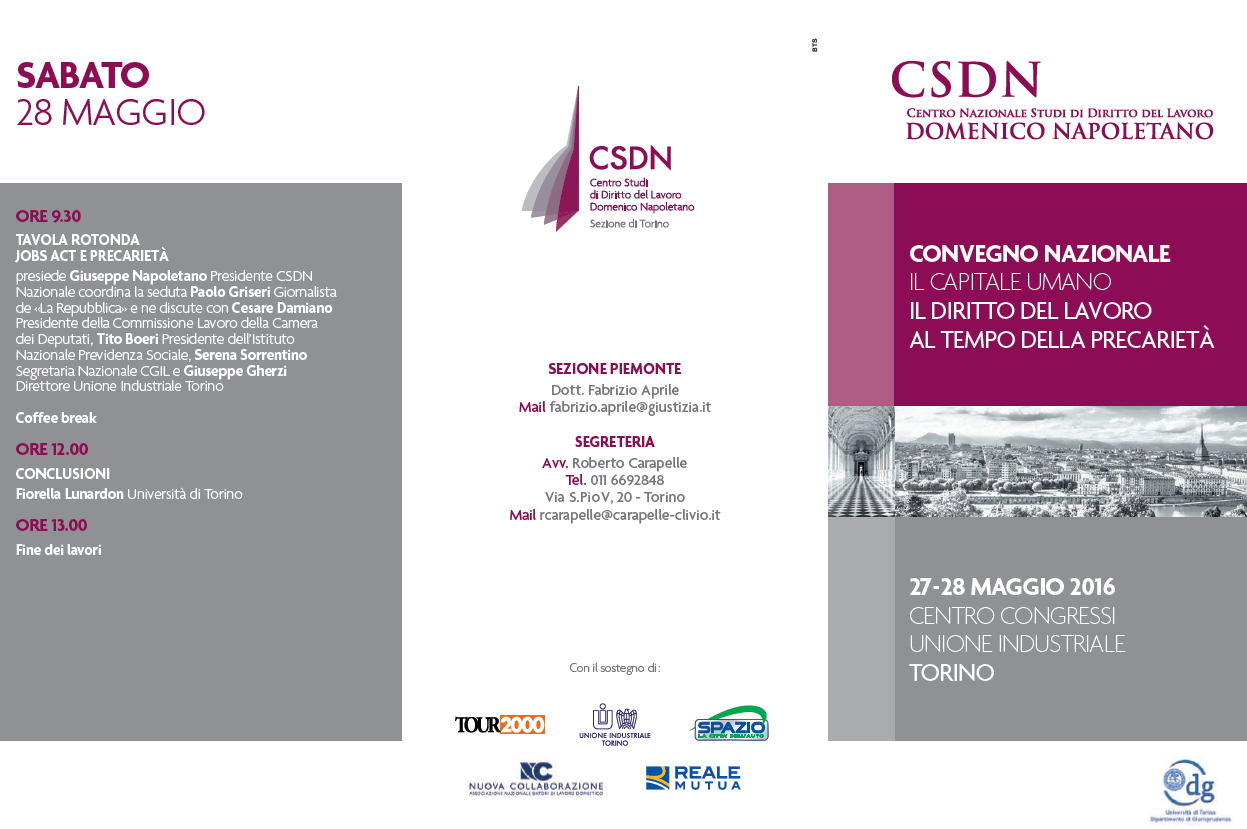 Da Ven, 27/05/2016 a Ven, 27/05/2016 Mode On-site-only 14/11/2022 TORINO - Il capitale umano | Il diritto del lavoro al tempo della precarietà (27-28 maggio 2016) on-site only | Centro Congressi Unione Industriale