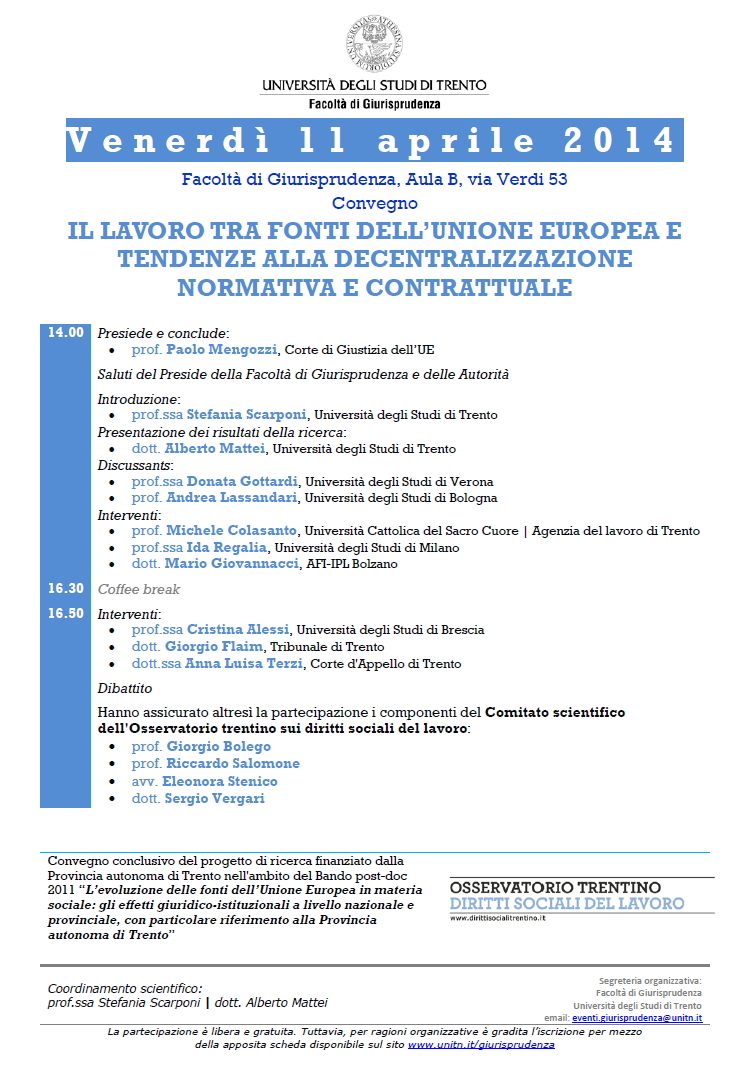 Da Ven, 11/04/2014 a Ven, 11/04/2014 Mode On-site-only 14/11/2022 TRENTO - Il lavoro tra fonti dell’Unione europea e tendenze alla decentralizzazione normativa e contrattuale on-site only | via Verdi 53 - 14.00