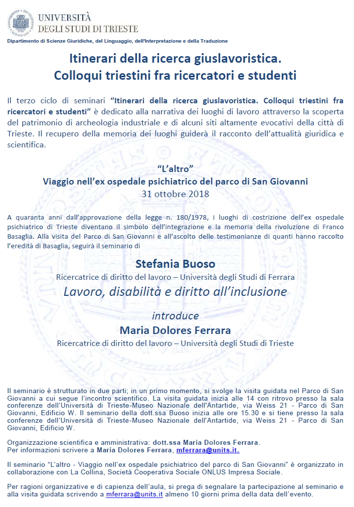 Da Mer, 31/10/2018 a Mer, 31/10/2018 Mode On-site-only 14/11/2022 TRIESTE - Itinerari della ricerca giuslavoristica. Colloqui triestini fra ricercatori e studenti on-site only | Via Weiss, 21 - ore 14