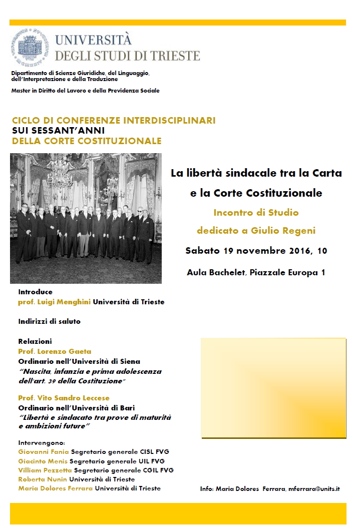 Da Sab, 19/11/2016 a Sab, 19/11/2016 Mode On-site-only 14/11/2022 TRIESTE - La libertà sindacale tra la Carta e la Corte Costituzionale on-site only | Piazzale Europa, 1 - ore 10