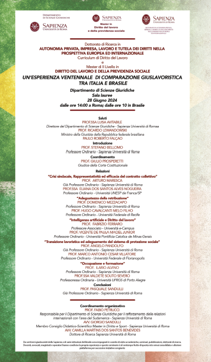 Da Ven, 28/06/2024 a Ven, 28/06/2024 Mode On-site-only File Programma2.29 MB 31/05/2024 Un'esperienza ventennale di comparazione giuslavoristica tra Italia e Brasile on-site only h. 14:00 | Dipartimento di Scienze Giuridiche, Roma Università La Sapienza di Roma Sala Lauree - Dipartimento di Scienze Giuridiche