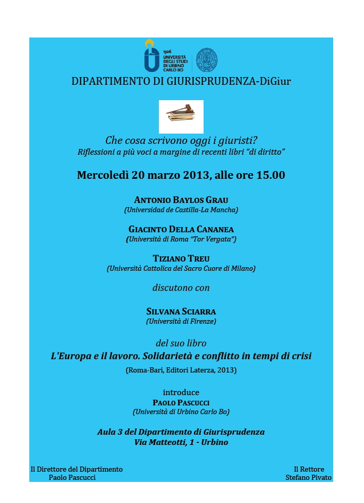 Da Mer, 20/03/2013 a Mer, 20/03/2013 Mode On-site-only 14/11/2022 URBINO - L'Europa e il lavoro. Solidarietà e conflitto in tempi di crisi. Presentazione del libro di Silvana Sciarra on-site only | via Matteotti 1 - 15.00
