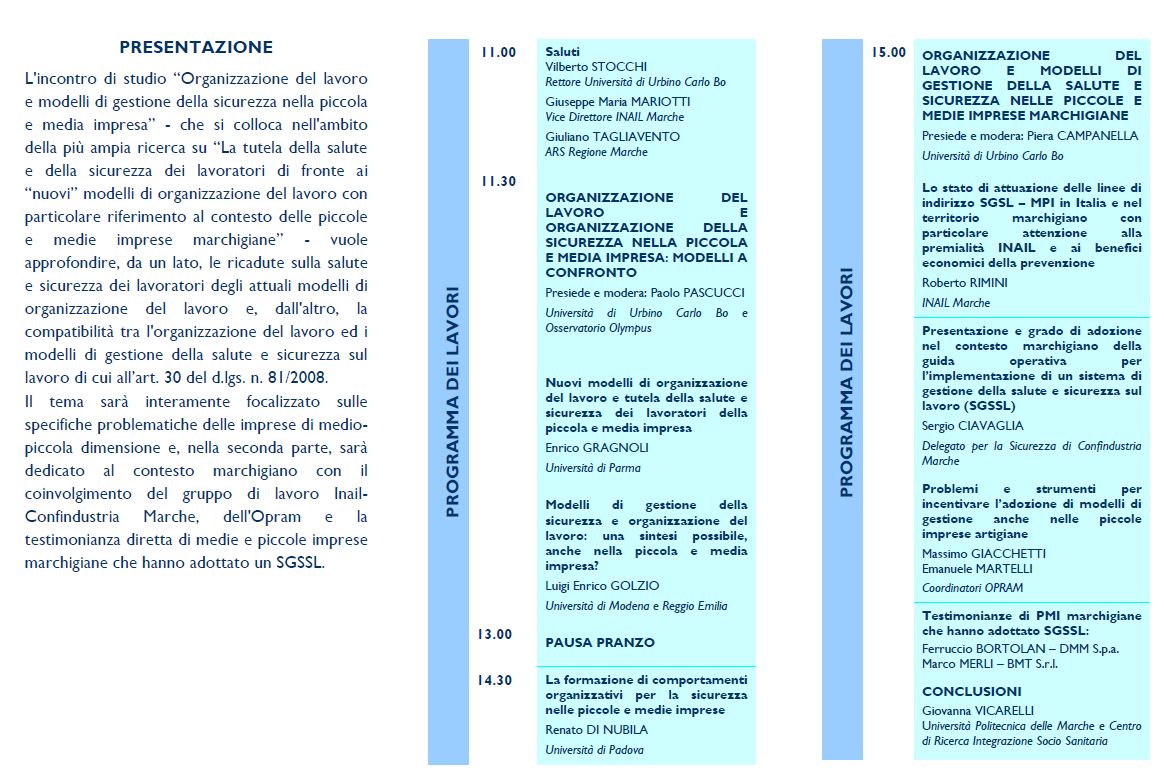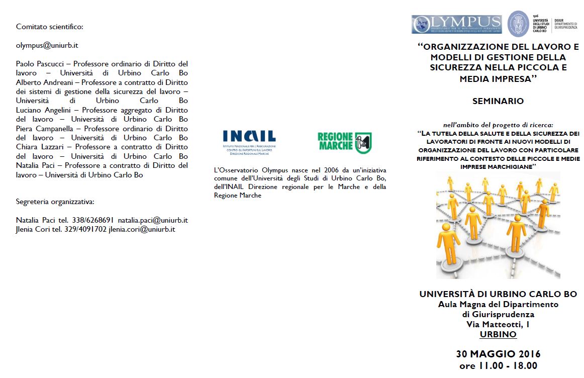 Da Lun, 30/05/2016 a Lun, 30/05/2016 Mode On-site-only 14/11/2022 URBINO - Organizzazione del lavoro e modelli di gestione della sicurezza nella piccola e media impresa on-site only | Via Matteotti, 1 - ore 11