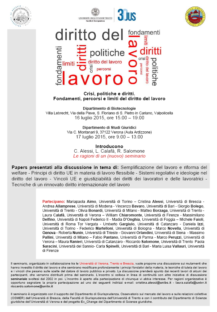 Da Gio, 16/07/2015 a Gio, 16/07/2015 Mode On-site-only 14/11/2022 VALPOLICELLA e VERONA - Crisi, politiche e diritti. Fondamenti, percorsi e limiti del diritto del lavoro (16-17 luglio 2015) on-site only | S. Floriano di S. Pietro in Cariano (Valpolicella) - Verona