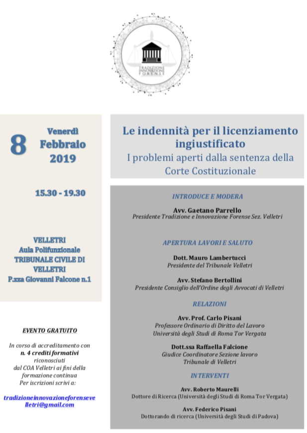 Da Ven, 08/02/2019 a Ven, 08/02/2019 Mode On-site-only 14/11/2022 VELLETRI - Le indennità per il licenziamento ingiustificato. I problemi aperti dalla sentenza della Corte Costituzionale on-site only | l’Aula Polifunzionale del Tribunale civile - ore 15.30