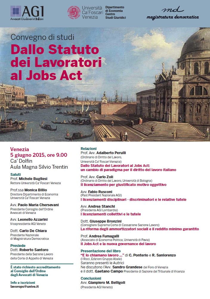 Da Ven, 05/06/2015 a Ven, 05/06/2015 Mode On-site-only 14/11/2022 VENEZIA - Dallo Statuto dei Lavoratori al Jobs Act on-site only | Aula Magna Silvio Trentin - 9:00