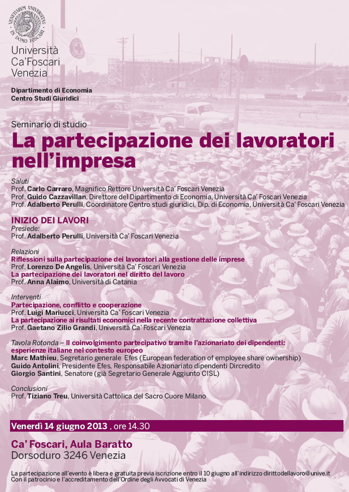 Da Ven, 14/06/2013 a Ven, 14/06/2013 Mode On-site-only 14/11/2022 VENEZIA - La partecipazione dei lavoratori nell’impresa on-site only | Dorsoduro, 3246 - 14,30