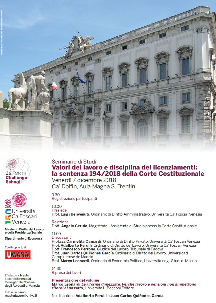 VENEZIA - Valori del lavoro e disciplina dei licenziamenti: la sentenza 194/2018 della Corte Costituzionale