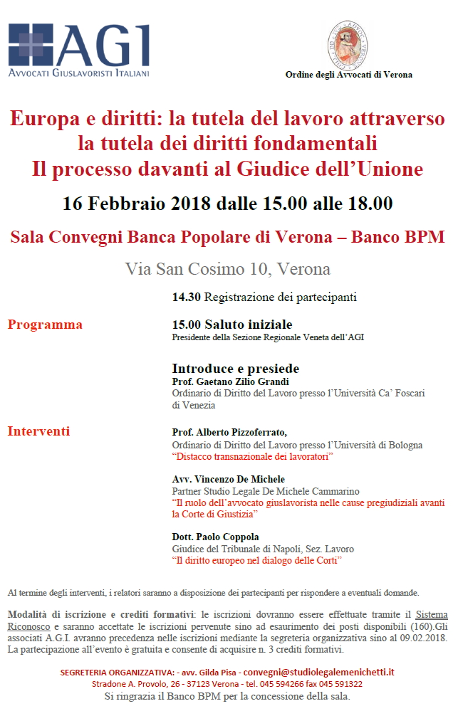Da Ven, 16/02/2018 a Ven, 16/02/2018 Mode On-site-only 14/11/2022 VERONA - Europa e diritti: la tutela del lavoro attraverso la tutela dei diritti fondamentali Il processo davanti al Giudice dell’Unione on-site only | Sala Convegni Banca Popolare di Verona - ore 15
