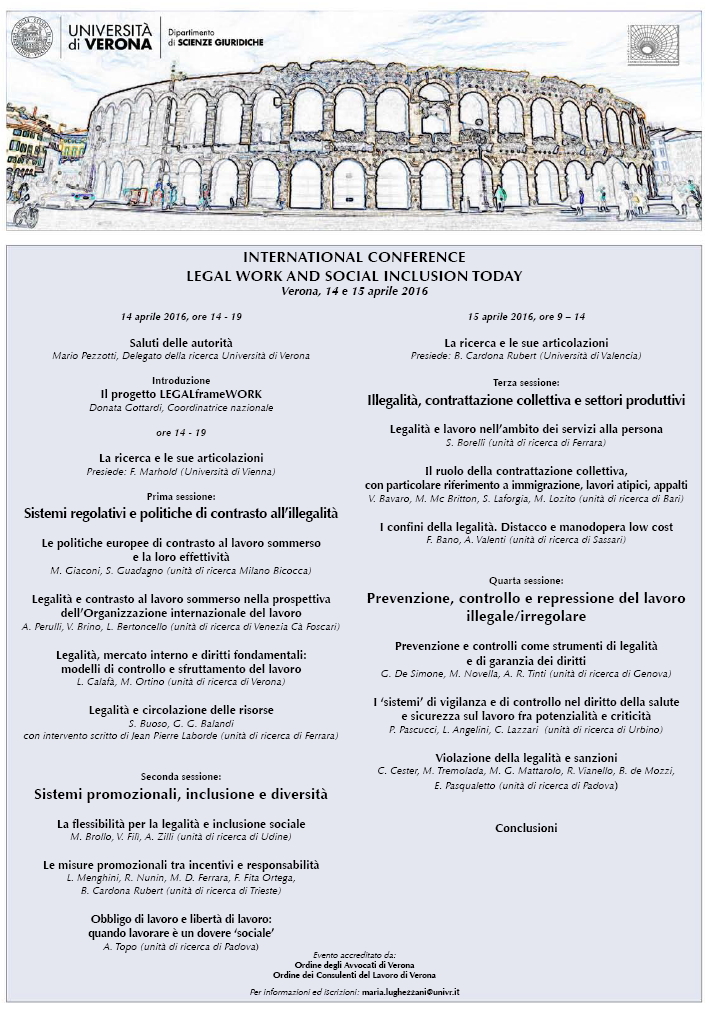 Da Gio, 14/04/2016 a Gio, 14/04/2016 Mode On-site-only 14/11/2022 VERONA - Lagal work and social inclusion today (14-15/04/2016) on-site only | Via C. Montanari, 9 - ore 14