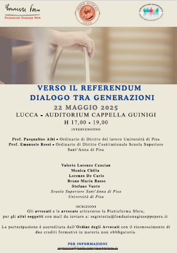 Da Gio, 22/05/2025 a Gio, 22/05/2025 Mode On-site-only File Programma365.42 KB 21/05/2025 Verso il referendum: dialogo tra generazioni on-site only h. 17:00 | Via della Quarquonia 1, Lucca Auditorium Cappella Guinigi Per informazioni: segreteria@fondazionegiuseppepera.it