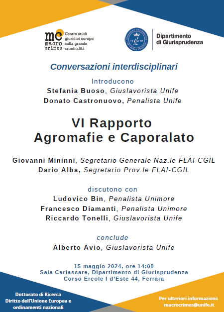 Da Mer, 15/05/2024 a Mer, 15/05/2024 Mode On-site-only File Programma163.18 KB 10/05/2024 VI Rapporto Agromafie e Caporalato on-site only h. 14:00 | Corso Ercole I d’Este 44, Ferrara Dipartimento di Giurisprudenza Sala Carlassare Per ulteriori informazioni: macrocrimes@unife.it