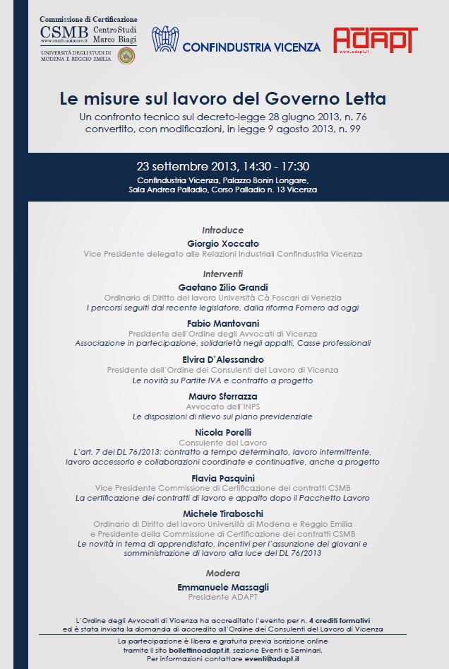 Da Lun, 23/09/2013 a Lun, 23/09/2013 Mode On-site-only 14/11/2022 VICENZA - Le misure sul lavoro del Governo Letta on-site only | Corso Palladio n. 13 - 14.30