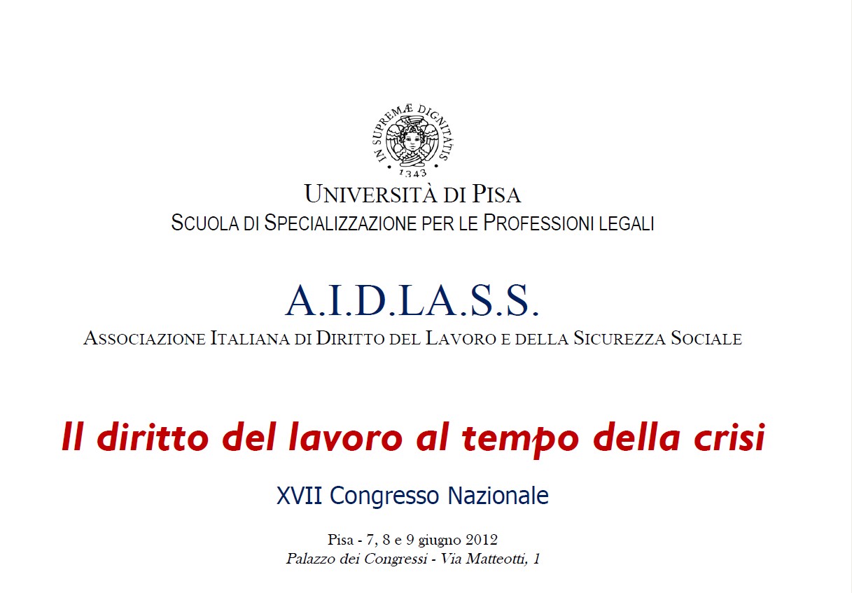 Da Ven, 08/06/2012 a Ven, 08/06/2012 Mode On-site-only 14/11/2022 XVII Congresso Nazionale A.I.D.L.A.S.S. Il Diritto del Lavoro al tempo della Crisi on-site only | Pisa, Palazzo dei Congressi Programma definitivo Scheda di iscrizione (scad. 24.5.2012) Scheda prenotazione alberghiera (scad. 17.5.2012)